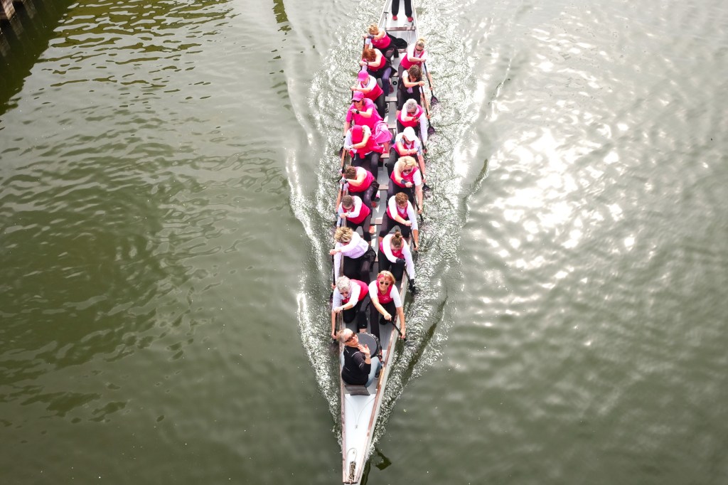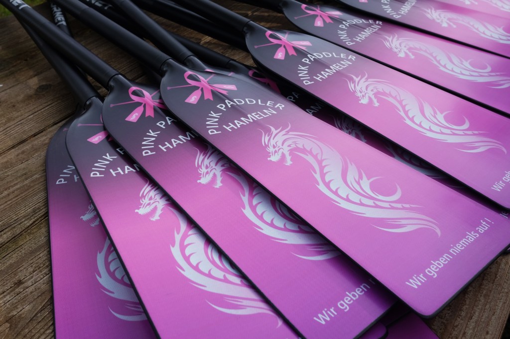 Deshalb war es für mich eine kleine Sensation, dass es beim Kanu Club Hameln ein spezielles Drachenboot-Team für Brustkrebserkrankte gibt, nach aber auch während der Therapie – die Pink Paddler. Da bin ich sofort dabei! Mit Barbies und Kens Welt haben wir nichts am Hut, aber Pink ist unsere Farbe, angefangen bei den Mützen, über die gesponserten T-Shirts bis hin zu den brandneuen Carbon-Paddeln, ebenfalls aus Spenden finanziert.