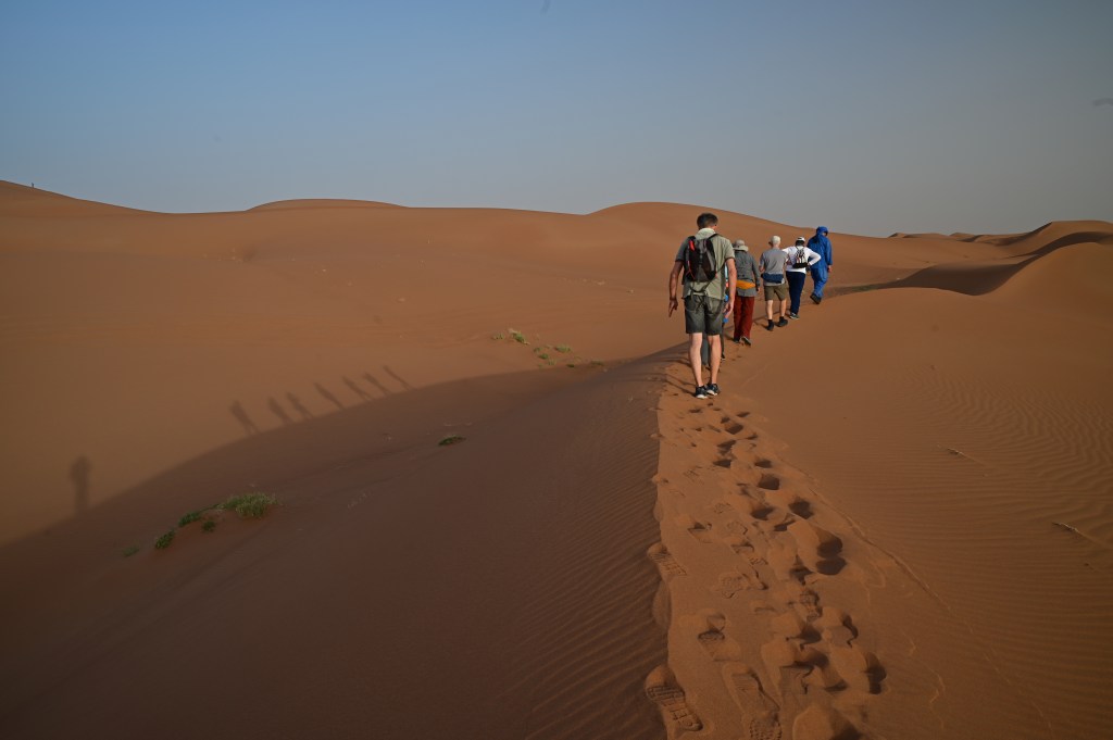 Wandern in den Dünen ist nicht einfach. Auf dem Grat rutsche ich mal nach rechts und mal nach links. Bergauf ist auch nicht einfach – ein Schritt hoch und schon rutsche ich wieder zwei Schritte runter. Am besten geht es mit Anlauf und Schnelligkeit – wenn die Kraft reicht. Runterlaufen gelingt dagegen mühelos und macht großen Spaß. Wer nicht laufen will, mietet ein Dromedar von den Nomaden und lässt sich sanft durch die Dünen schaukeln.