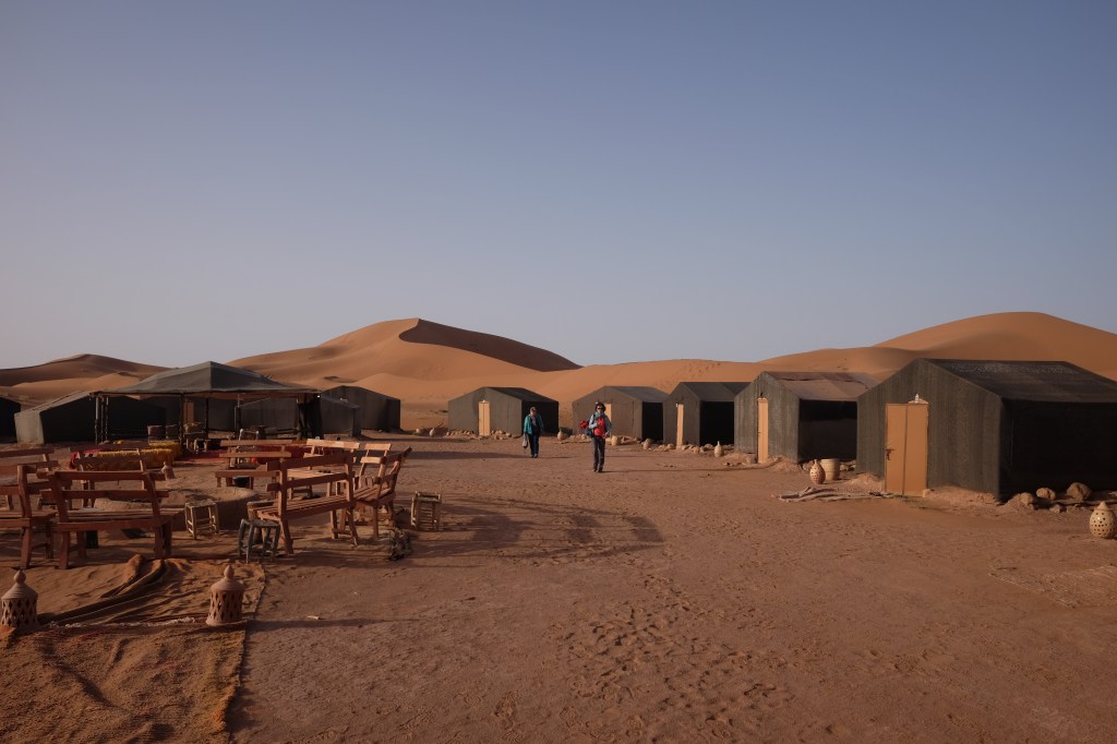 Von Mhamid, dem letzten Ort mit Straße fahren wir mit Jeeps rund 50 Kilometer zu einem Zeltcamp im Wüstengebiet Erg Chebbi, die gut bewachte Grenze zu Algerien im Süden ist nur 70 Kilometer entfernt. Bei dieser Autotour müssen die Bandscheiben stabil sitzen und besser, man hat vorher nicht viel gegessen. Erg Chebbi ist das größte zusammenhängende Sandwüstengebiet Marokkos mit bis zu 150 Meter hohen Dünenkämmen. Klettert man auf eine Düne, stellt man fest, dass hier einige Zeltcamps aufgebaut sind. Wen wundert es – von dieser Sandwüste hat Marokko nicht viel, aber viele Touristen wollen dort sein.